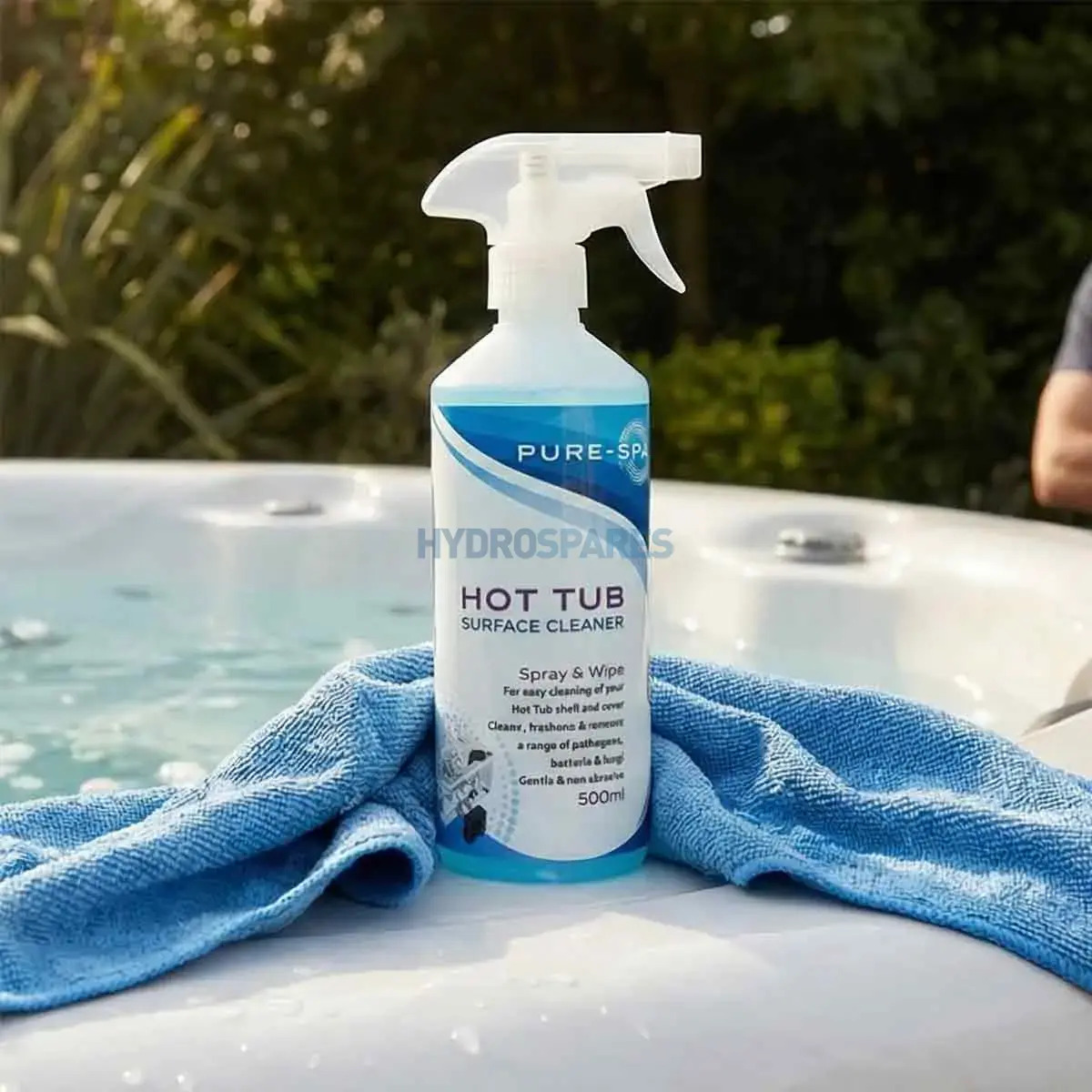 Pure-Spa Hot Tub surface cleaner is a multi use cleaning product that will help to remove grime, waterline scum marks and bathing deposits from your hot tub surfaces. The non-abrasive formulation means that there is no risk of damage to your spa finish. Just spray directly onto surfaces and wipe away with a soft damp cloth.